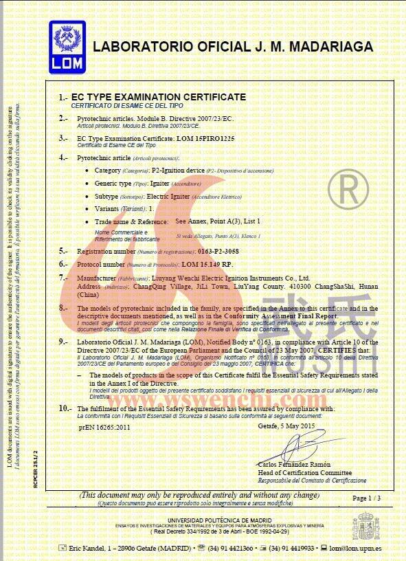 瀏陽市文馳電點(diǎn)火具有限公司(原培文電子點(diǎn)火器材廠),創(chuàng)建于1998年,是一家專業(yè)從事研制銷售電子點(diǎn)火產(chǎn)品的民營(yíng)科技企業(yè),是我國(guó)第1枚煙花用電點(diǎn)火頭生產(chǎn)者,是《煙花爆竹電點(diǎn)火頭國(guó)標(biāo)》牽頭起草單位。公司位于中國(guó)“煙花之鄉(xiāng)”湖南省瀏陽市,地理位置優(yōu)越,交通便利。 我公司研制的對(duì)象是用電能引燃火藥、做機(jī)械功等預(yù)定功能的一次性使用的元件或裝置,包括電點(diǎn)火頭(英文名ElectricMatch or Electric Igniter,中文俗稱“電火柴”或“電發(fā)火頭”)、電點(diǎn)火管和延期電點(diǎn)火管;我們估且在以后的產(chǎn)品技術(shù)欄中將我們研究的產(chǎn)品統(tǒng)稱為電點(diǎn)火具,將電點(diǎn)火器看成是用于提供和控制供給電點(diǎn)火元件點(diǎn)火的電能器材;我們研究的電點(diǎn)火橋路有橋絲式、無橋絲···